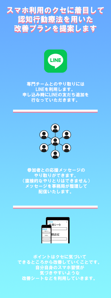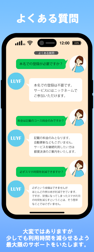 LUYF(ルイフ)について –LUYFに参加してみる– お問い合わせをする –LUYFに参加してみる– お問い合わせをする –LUYFに参加してみる– お問い合わせをする –LUYFに参加してみる– お問い合わせをする –LUYFに参加してみる– お問い合わせをする LUYF(ルイフ)はスマートフォンの過剰な利用を削減するためのサービスです。認知行動療法を用いてスマートフォン利用のクセにアプローチすることで少しずつ利用時間を削減していきます。 LUYFの運営会社につきましてはこちらをご覧ください。 特定商取引法に基づく表記プライバシーポリシー